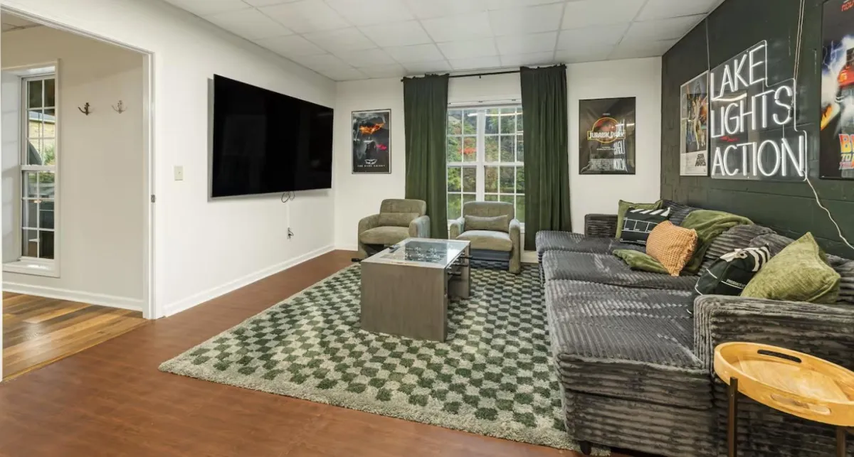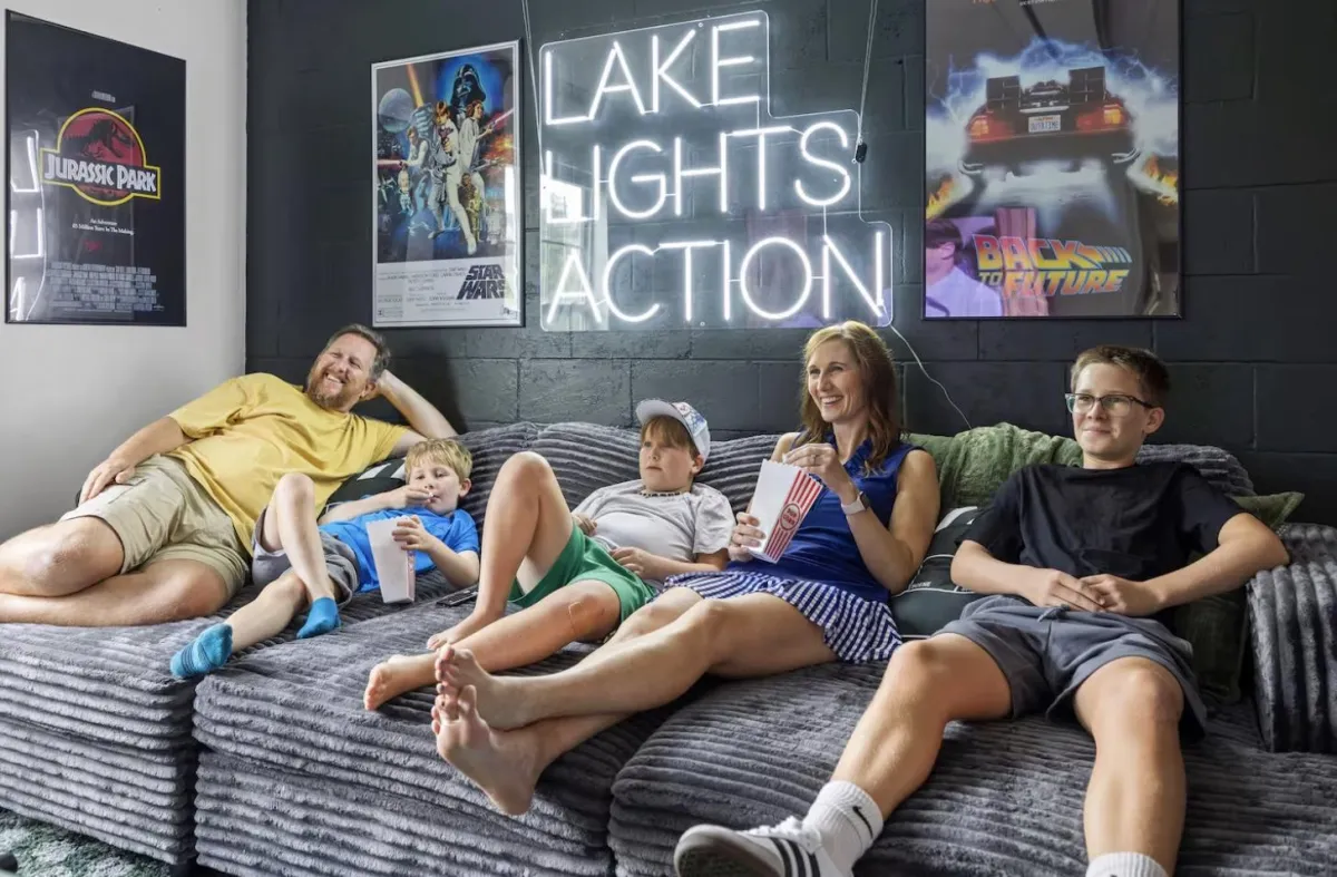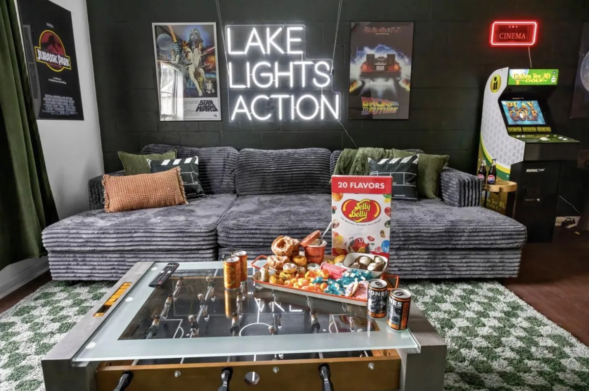 ✦ Theatre Room – Large screen, streaming, oversized couch, and popcorn machine.