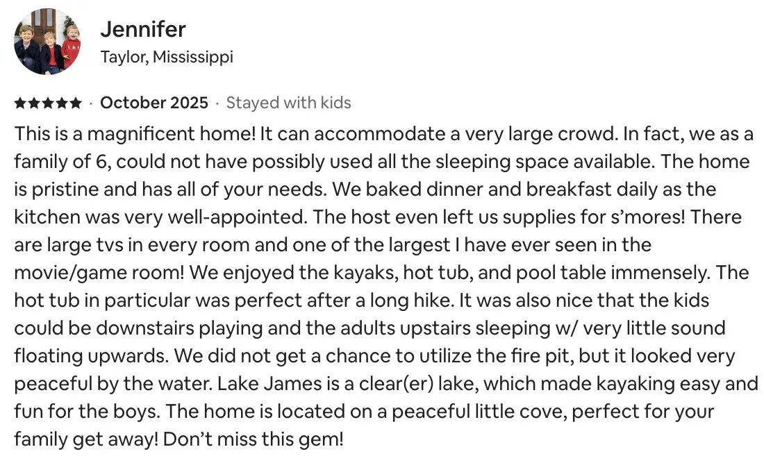 Start your morning with coffee on the deck or a peaceful kayak paddle at sunrise, then spend the day fishing, boating, or tubing. Grab ice cream at Lake James Marina, grill dinner with lake views, and end the night in the hot tub or around the fire pit sharing laughs under the stars.